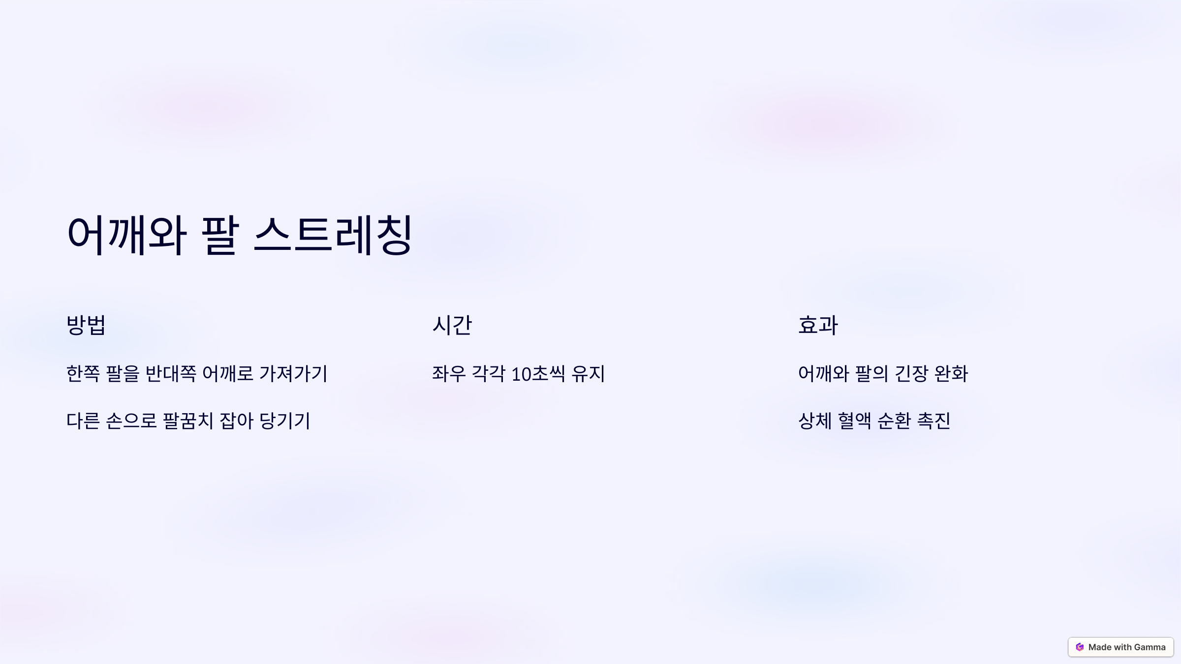 - 효과: 어깨와 팔의 긴장을 완화하며, 상체의 혈액 순환을 촉진합니다.