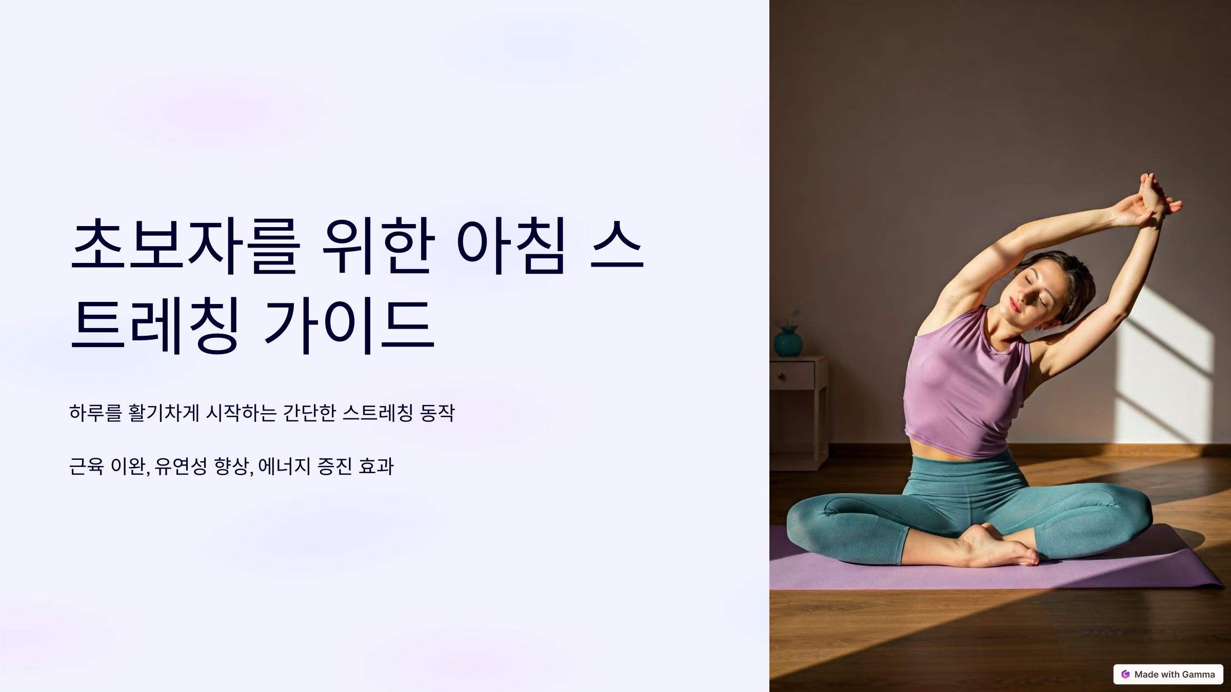 아침 스트레칭으로 하루를 상쾌하게 시작해 보세요! 꾸준한 스트레칭은 몸을 건강하게 유지하는 데 큰 도움이 됩니다.
