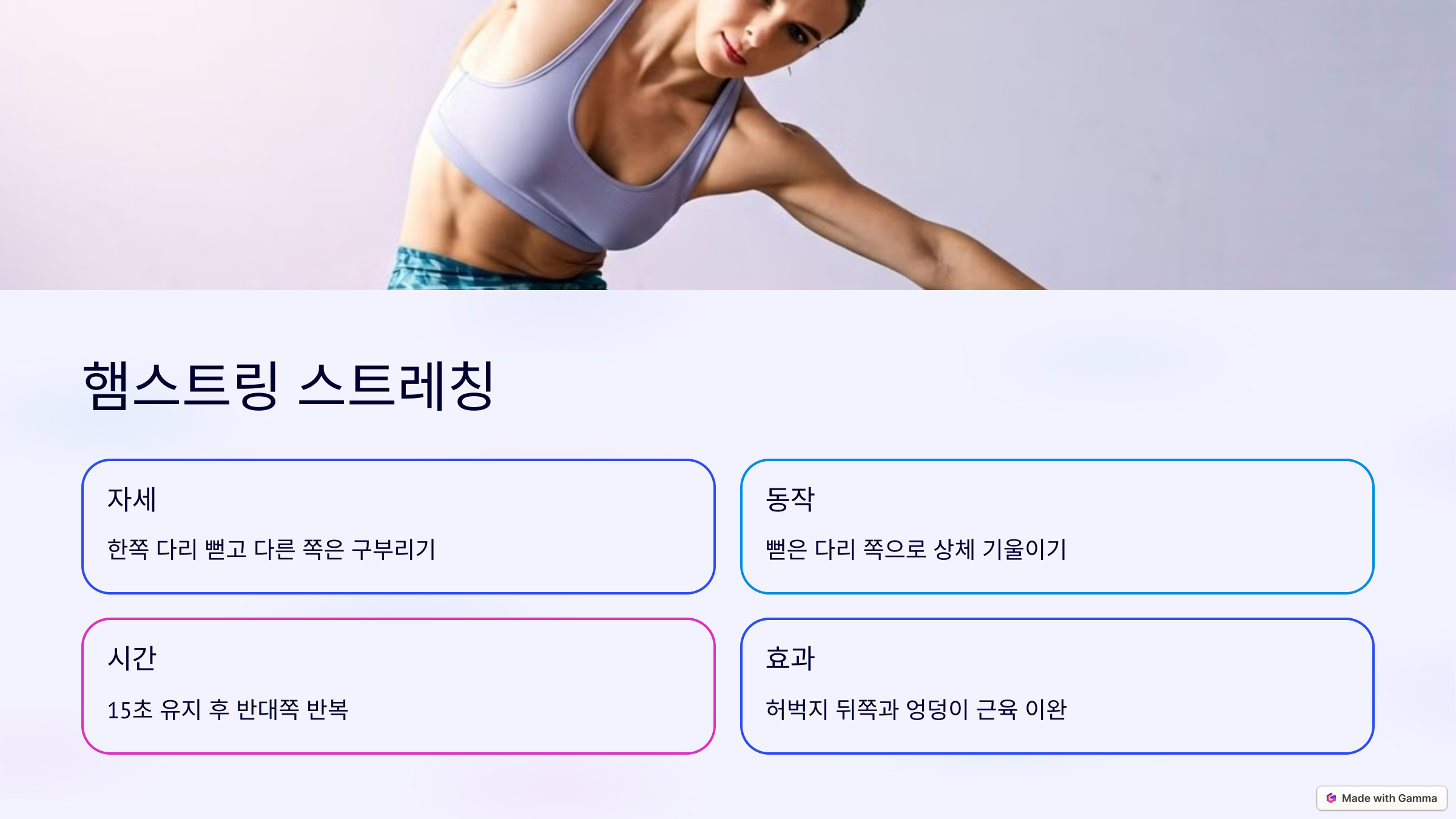 서서히 다리를 늘려주는 햄스트링 스트레칭은 다리와 엉덩이 근육에 효과적입니다.