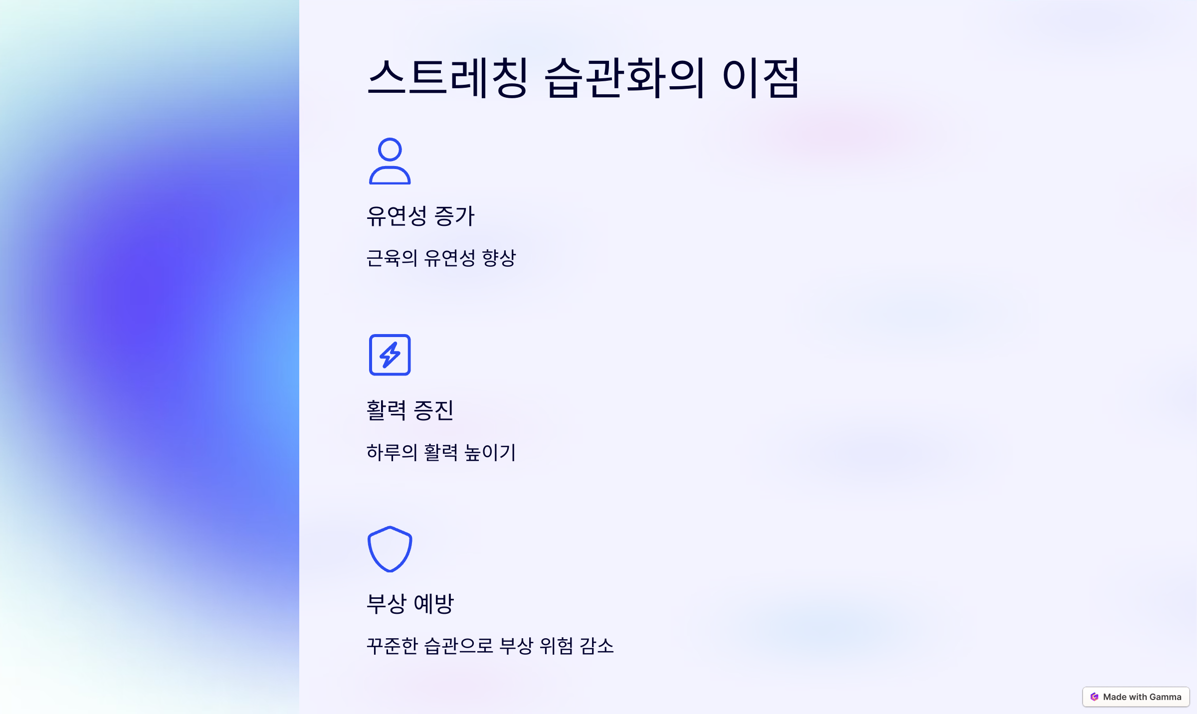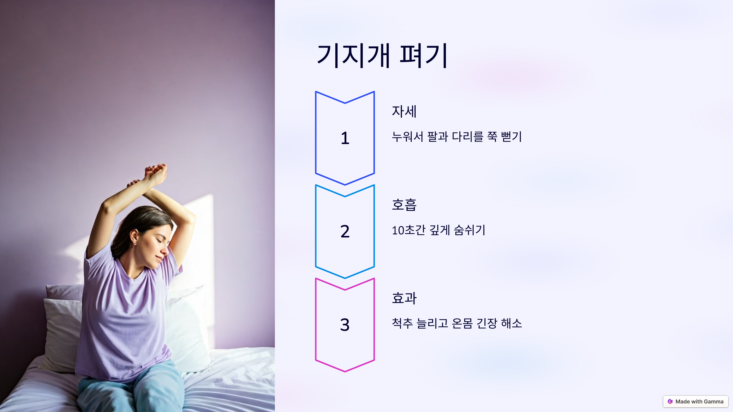 - 근육 이완: 밤새 뭉친 근육과 관절을 부드럽게 풀어줍니다.