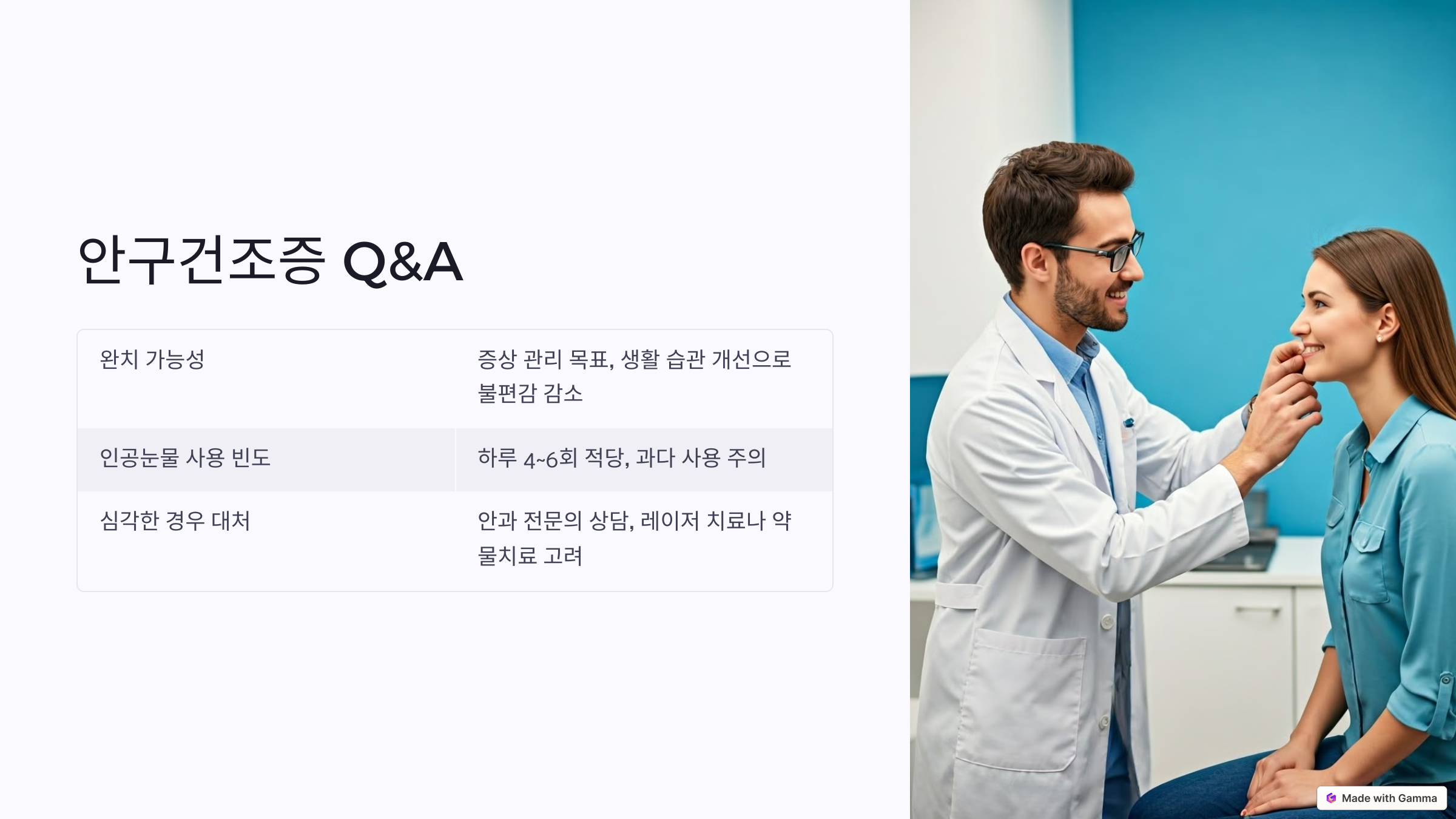 A1. 안구건조증은 완치보다는 증상 관리를 목표로 하는 경우가 많습니다. 생활 습관을 개선하고 인공눈물을 사용하여 눈의 수분을 유지하면 불편감을 상당히 줄일 수 있습니다.