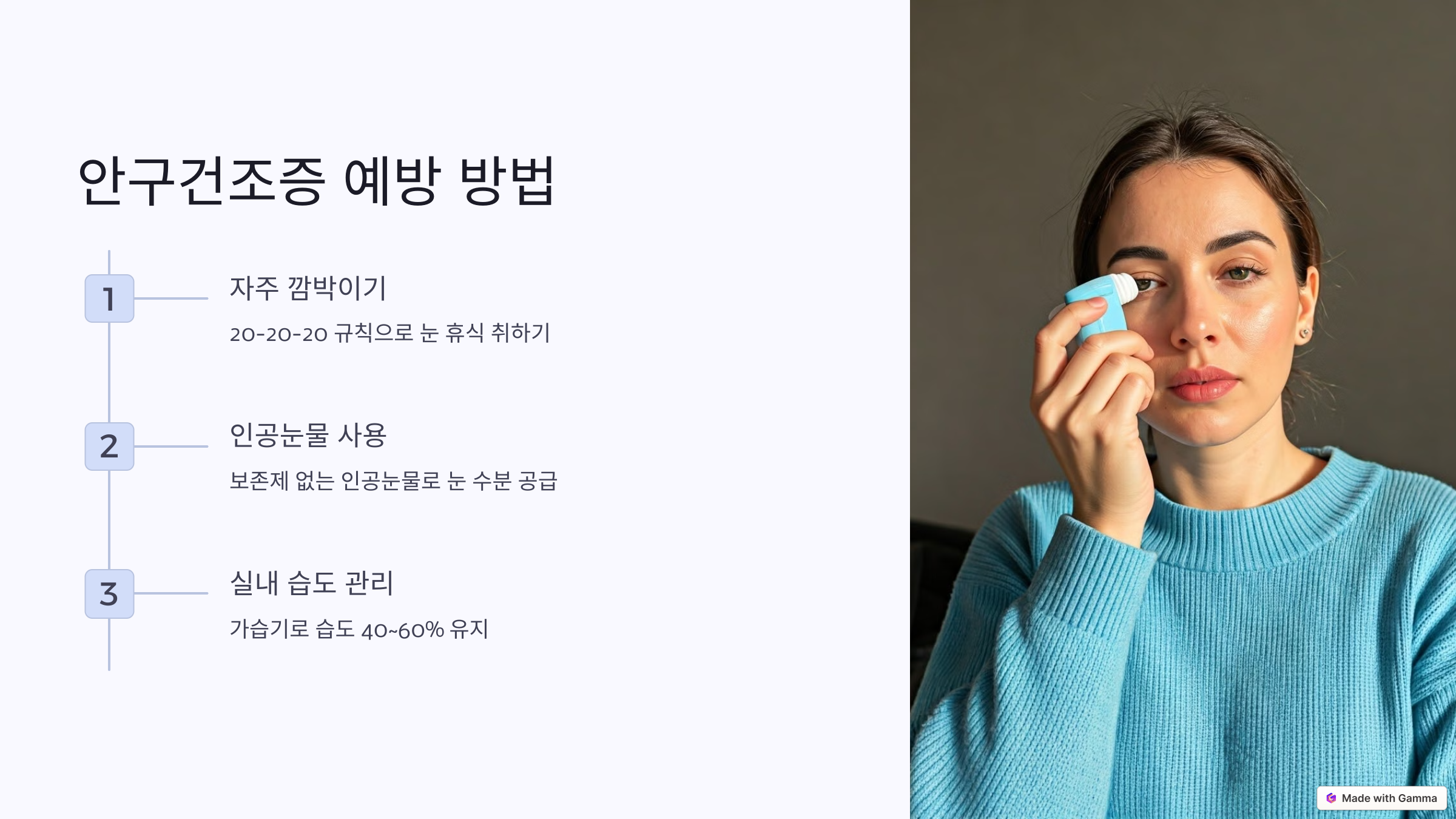 일상적으로 눈이 건조하다면 보존제가 없는 인공눈물을 사용해 눈에 수분을 공급해주는 것도 좋은 방법입니다. 특히 디지털 기기를 오래 사용한 후, 눈이 뻑뻑하거나 따가운 느낌이 들 때 인공눈물을 사용하면 즉각적인 완화 효과를 볼 수 있습니다.