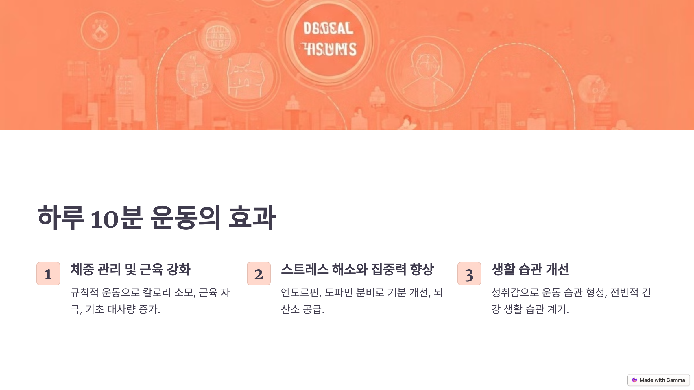 하루 10분 운동은 누구나 쉽게 접근할 수 있는 건강 관리법입니다. 짧은 시간이라도 매일 꾸준히 실천한다면 몸과 마음의 변화를 느끼게 될 것입니다. 오늘부터 실천해 보세요!